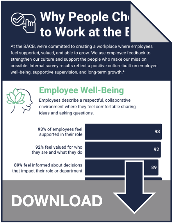 The BACB is committed to investing in our employees’ professional development. We strive to provide the appropriate training and development programs to help employees meet their performance expectations, increase retention, enhance innovation, improve customer satisfaction, and foster a positive workplace culture.